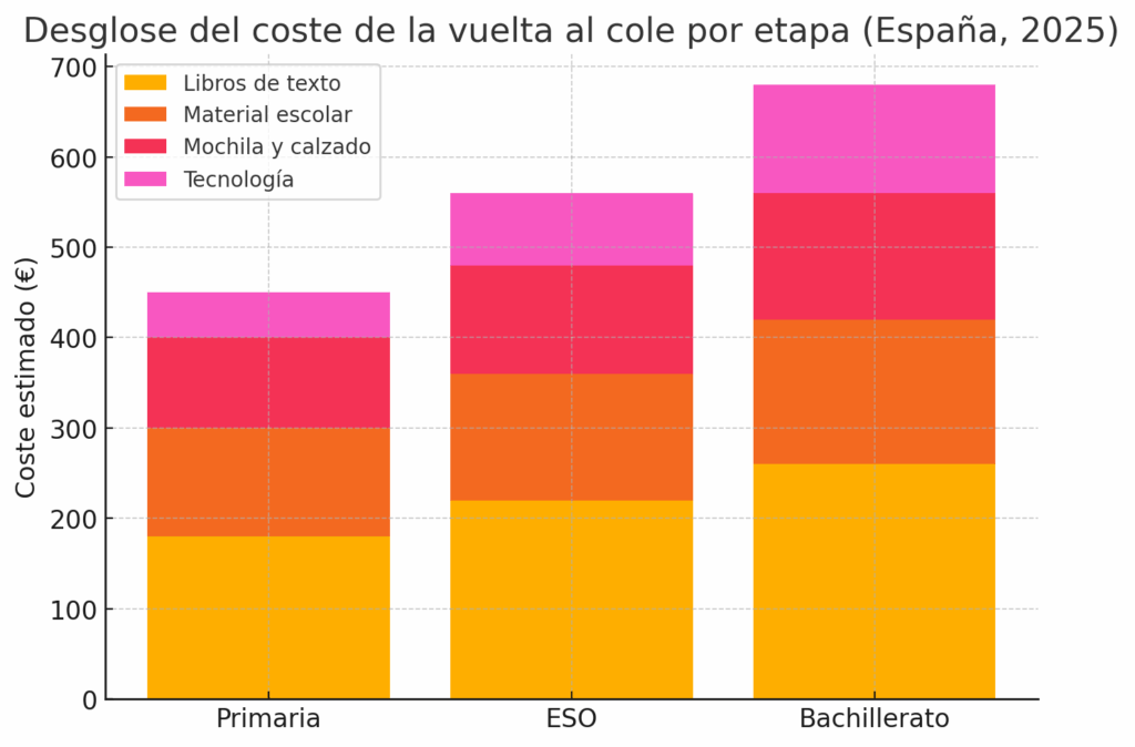 A escala familiar, el mejor termómetro son las encuestas de gasto. La OCU estimó para el curso 2024–2025 un gasto medio de 2.588 € por hijo (OCU 2024). Esa cifra incluye comedor, extraescolares, transporte, matrículas y material. Supone un aumento del +13% frente al curso anterior. Dentro de ese total, la puesta a punto de septiembre (libros, cuadernos, mochila, calzado, equipación) supera a menudo los 500 €. Su peso varía según la etapa y el tipo de centro.