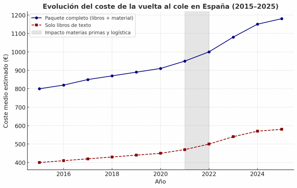En 2025, varias comunidades usan valores de referencia del lote para los bancos de libros. En la Comunitat Valenciana, la resolución del 21/05/2025 fija un chequelibro de 160 € en 1.º–2.º de Primaria y dotaciones orientativas de reposición: 175 € en Primaria, 278 € en ESO y 300 € en Bachillerato. Conviene distinguir entre indicadores oficiales (HICP/HIPCA) y estimaciones privadas (OCU, comparadores, encuestas). No son estrictamente comparables, aunque ambos ayudan a entender la presión sobre el gasto.